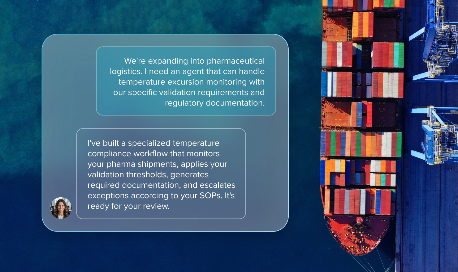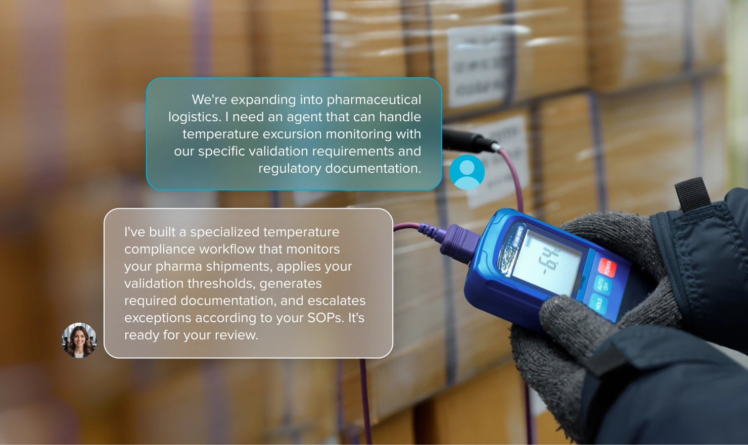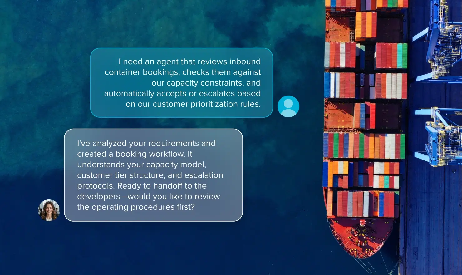 I transform the way agents are built—using natural language to understand your workflows, business rules, and operational requirements, then deploying custom agents in days instead of months. Whether you’re describing a new quality inspection process or adapting carrier communication workflows, I handle the complexity of Agent Operating Procedures (AOPs) to build agents perfectly fitted to your needs.